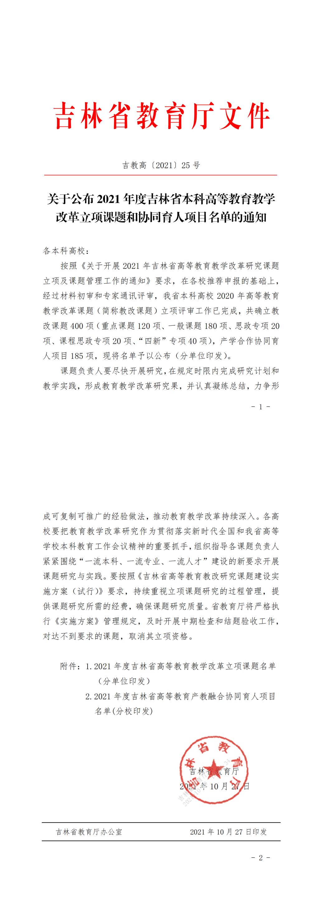 关于公布2021年度吉林省本科高等教育教学改革立项课题和协同育人项目名单的通知