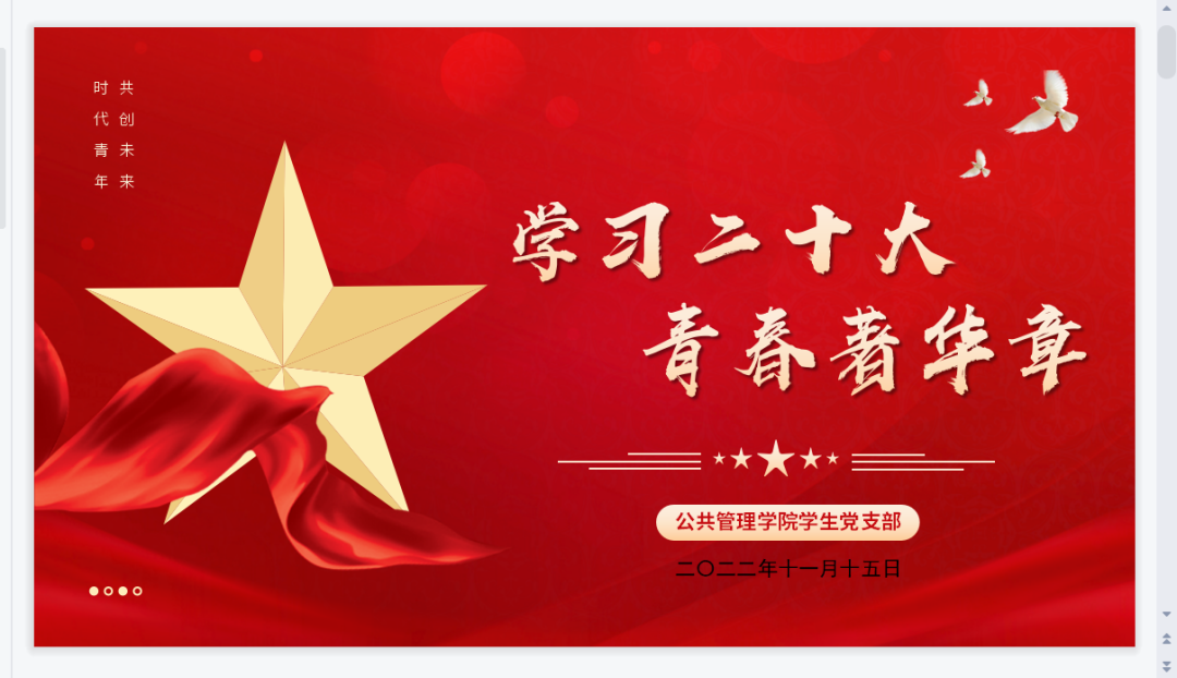 通过本次党的二十大报告学习活动,学生党支部深刻领会党的二十大精神实质、核心要义和丰富内涵,深受启发和鼓舞。作为新时代青年,要始终牢记使命,有所作为,努力提升专业技能,提高自身综合素质,愿我们都能观来时风雨,托前路朝阳,为中国民族伟大复兴、发展而燃烧!