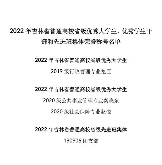 在此次评比活动中斩获佳绩,其中2019级行政管理专业龙巨荣获省级优秀学生干部称号,2020级公共事业管理专业秦晓东、社会保障专业赵悦获得优秀大学生称号,190906团支部获得省级先进班集体称号。