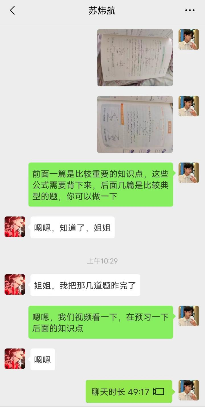 此次“学伴+”活动,我帮助到了遇到英语和数学难题的一名初二学生,根据该生自身具体学习情况,我在英语学习方面,重点给他讲解了语法、词汇内容。并且为他制订了一个英语每日单词背诵计划。此外,也对其作业进行了辅导。在数学方面,我为他讲解了他薄弱的的证明三角形全等性方面的知识点。与此同时,我们积极沟通交流,看到他的学习一点点的进步,我感到非常欣慰。