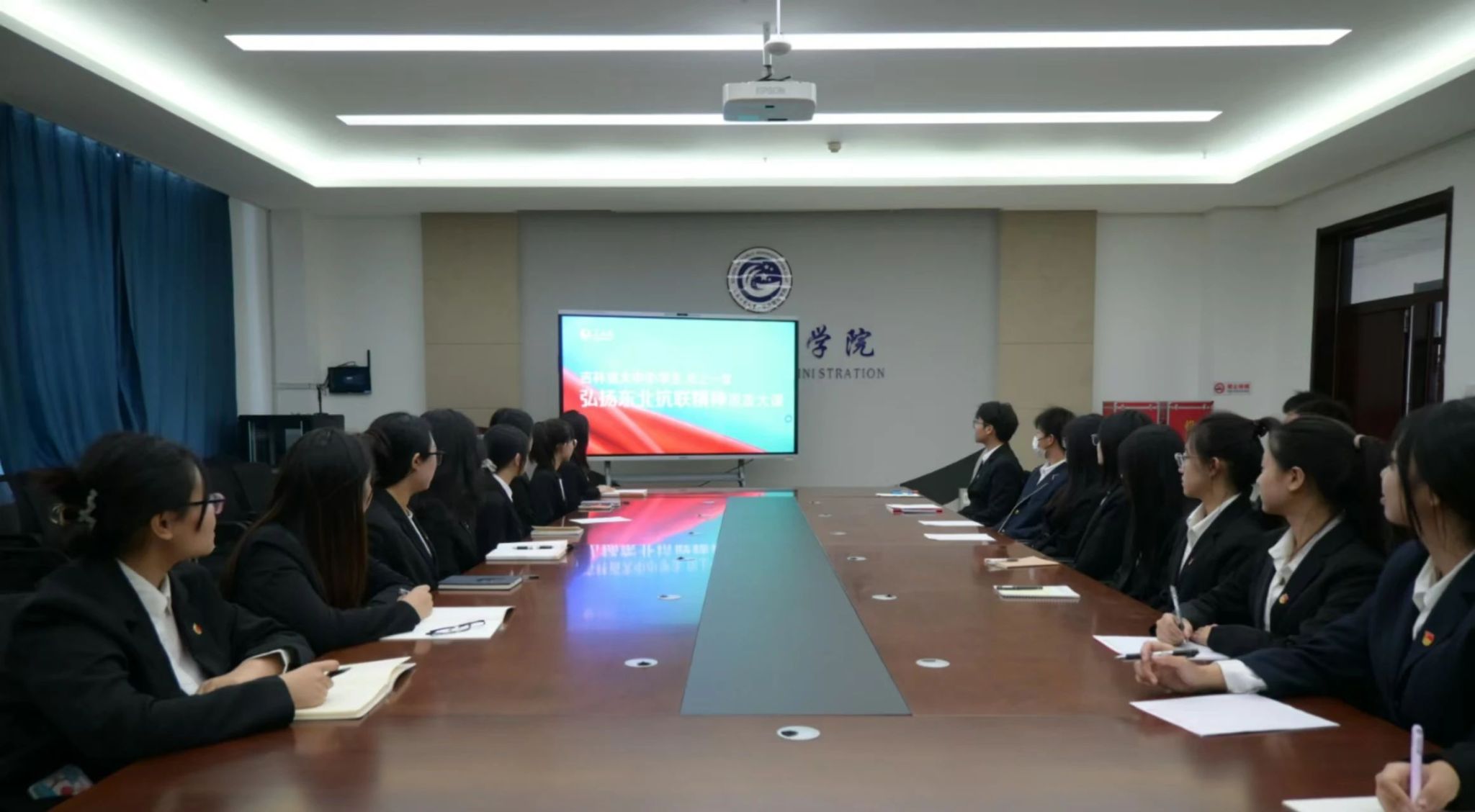理论自学小组在北湖东校区主楼401会议室观看由吉林省教育厅联合吉林杨靖宇干部学院、人民网共同打造“赓续红色血脉,争做时代先锋”弘扬东北抗联精神思政大课。