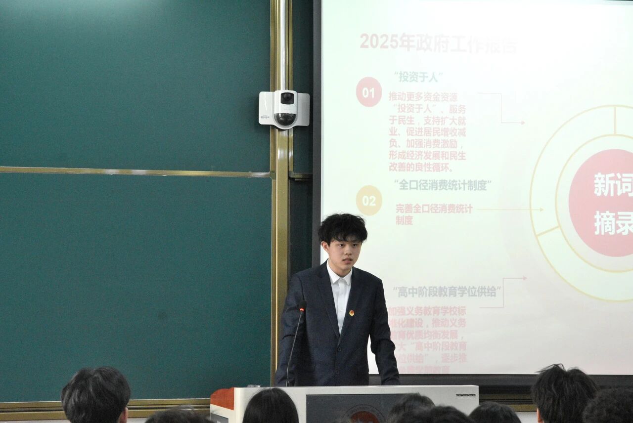在此活动中,我们从四个方面深入学习两会精神。2025年政府工作报告新词频出。投资于人"强调将资金资源向民生倾斜,促进经济与民生的良性循环;"优质本科扩容"推动高校分类改革,助力"双一流"建设;"新型离岸贸易"培育贸易新增长点;"高中阶段教育学位供给"着眼教育均衡发展;"全口径消费统计制度"完善消费数据统计;"创投基金差异化监管制度"激发创业投资活力。报告中的"加减乘除"更是亮点十足。