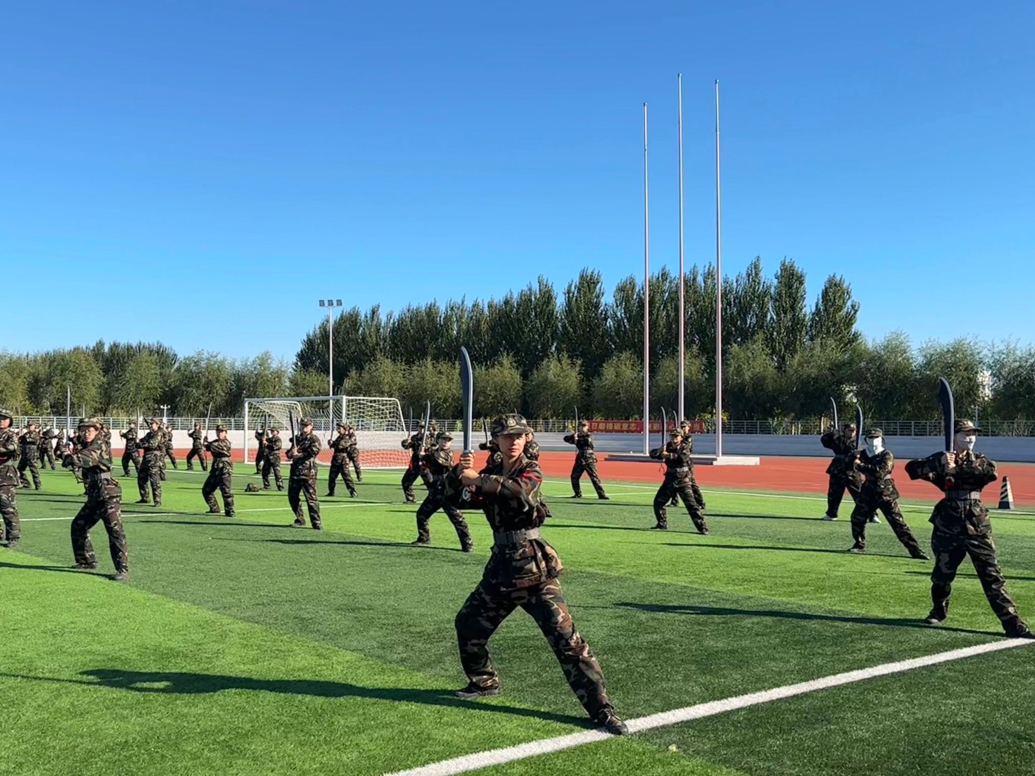 大刀操的红绸随挥臂翻飞,刀光映着专注的眉眼;分列式的队伍反复校准间距,哪怕驻足时也保持挺拔站姿。迷彩服上的尘土与汗渍,都是成长的勋章。