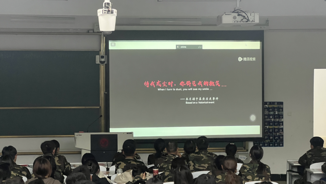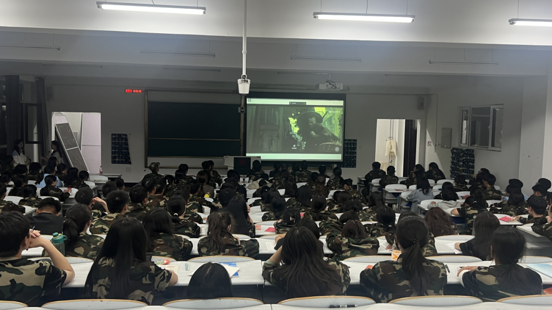 于北湖东区艺术楼221教室组织25级全体新生共同观看红色影片《八佰》。以光影为媒介,带领同学们回溯历史烽烟,感悟铁血军魂,在沉浸式观影中深植爱国情怀,凝聚军训奋进力量。