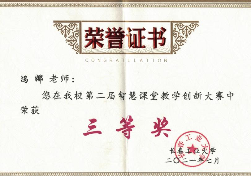 近日,香港三级 教师冯娜同志在香港三级 第二届智慧课堂教学创新大赛中获得三等奖。