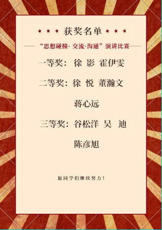 此次活动不仅让同学们感受到演讲的乐趣与意义,同时激发了同学们的斗志。营造了勤于思考善于交流乐于展现的环境,让同学们有了一个抒发自我的舞台。