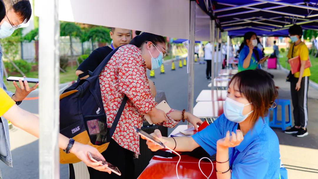 积极配合学校防疫工作的安排,坚决遵守防疫工作要求。学院团委提前挑选了八十九名志愿者同学,并对他们进行了专业的志愿服务培训。新生报道在校门口进行消毒、核验身份、核验健康码及行程码,再由志愿者引导至各年级报道处完成报道手续。