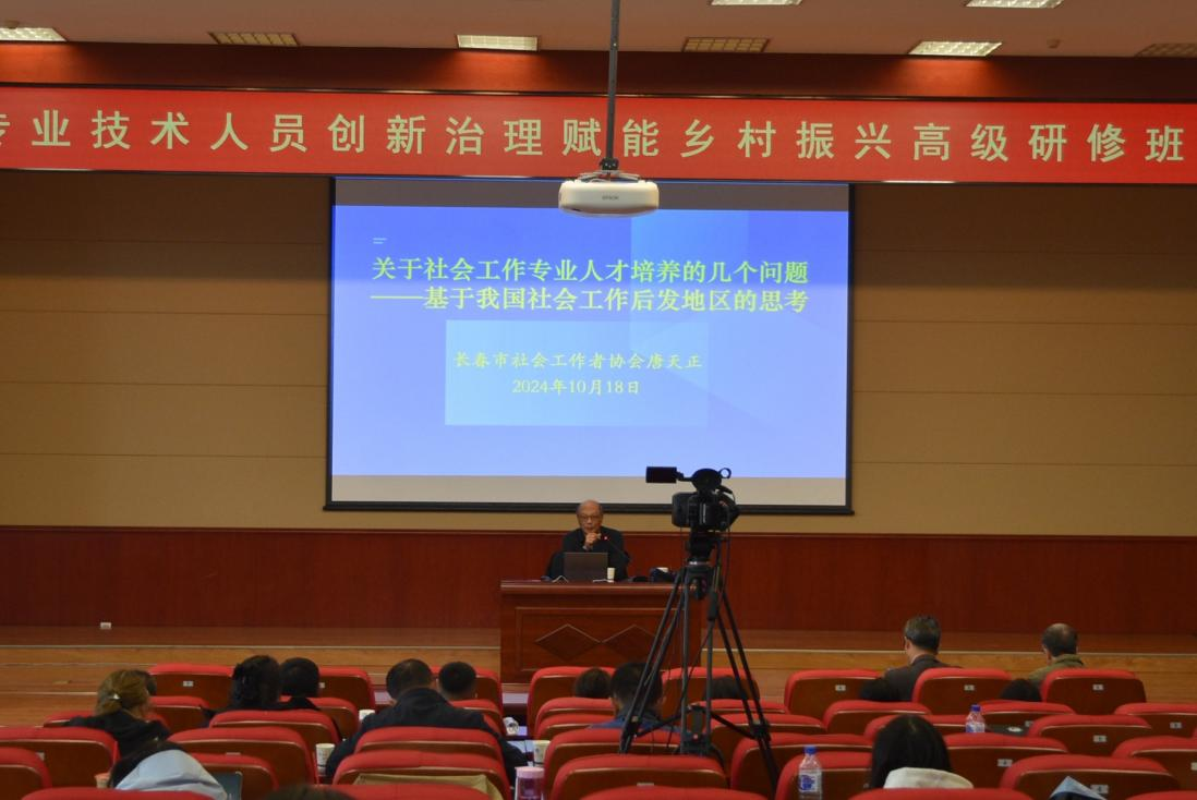 本网讯(通讯员:汤道化)10月18日下午,国家级专业技术人员“创新治理赋能乡村振兴”高级研修班活动在我校南湖校区学术报告厅继续进行。第八场主讲嘉宾特邀长春市社会工作者协会唐天正教授,他为学员们作了题为“关于社会工作专业人才培育的几个问题——基于我国社会工作后发地区的思考”的讲座。香港三级