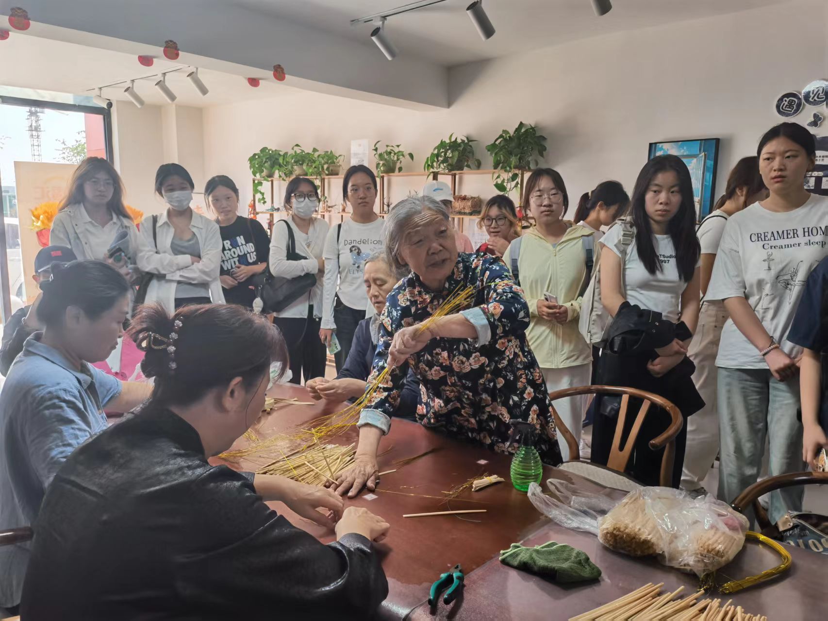 文化浸润,激发服务灵感。在社区非遗工作坊,八十岁高龄的国家级草编非遗传承人现场展示的精湛工艺,深深吸引了年轻学子。在匠人的指尖与讲解中,同学们近距离触摸到乐丰社区的文化灵魂,理解了非遗作为社区治理重要抓手的独特价值,为后续设计融合文化元素的服务方案埋下创新种子。